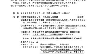 お知らせ 防災避難訓練のお知らせ 2月の回覧版でお知らせしておりますとおり、3/14(土)に南町の防災避難訓練が行われます。下記お知らせのとおり、ご参加ください。下記にある「世帯用安否確認」は、(こちら)クリックでも行けます。ぜひ登録してみてください。 2026.02.07 お知らせ