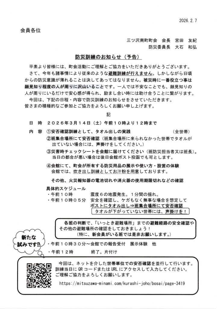 2月の回覧版でお知らせしておりますとおり、3/14(土)に南町の防災避難訓練が行われます。下記お知らせのとおり、ご参加ください。